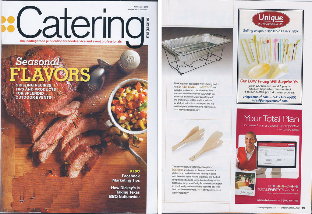 Catering magazine - June 2015. bambu introduces the first disposable bamboo tongs specially designed for the caterer. These compostable tongs are made from certified organic bamboo and cleverly engineered to provide a natural and elegant alternative to plastic tongs.